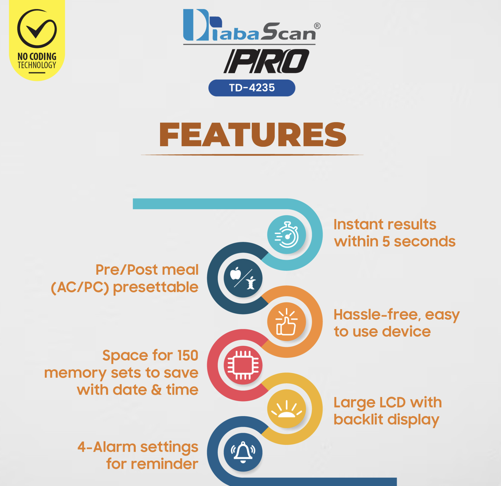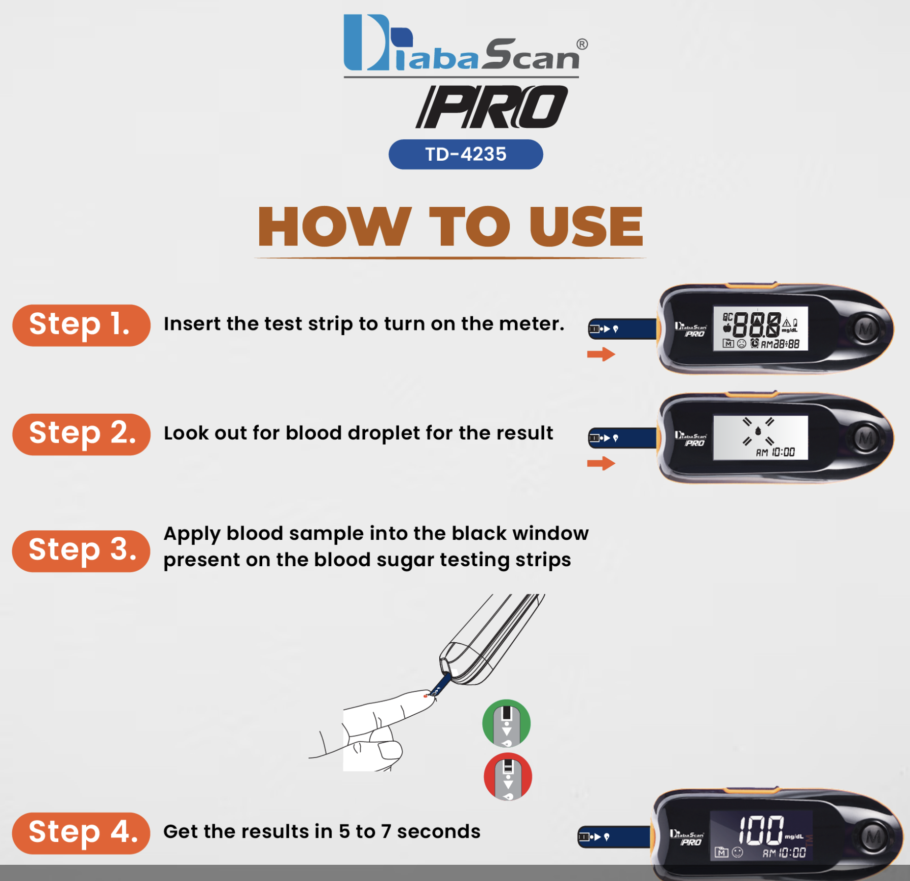 Diabascan Pro Glucometer comes with a product strip. This blood glucose testing monitor is an advanced 'No Coding Technology' device that provides fast, accurate, and reliable blood sugar testing results within 7 seconds anytime & anywhere.What’s inside the Box? 1 Meter, 1 Lancing Device, 10 Lancets, 1 Cary Bag, 1 Manual,1 Warranty Card